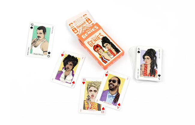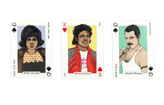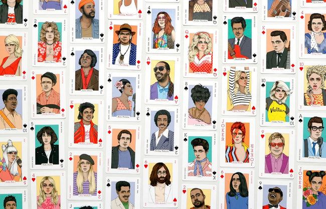 Aus einem gewöhnlichen Kartenspiel wird etwas ganz Besonderes: Die vier Musikgenres Pop, Rock 'n' Roll, Folk & Country und Soul, Blues & R&B ersetzen die vier üblichen Farben Herz, Pik, Kreuz und Karo. Die 52 Spielkarten zeigen Portraits der großen Stars des Musik-Olymps, darunter Madonna und Prince, Kurt Cobain und Jimi Hendrix, Johnny Cash und Bob Dylan, und Nina Simone und Amy Winehouse. Und dann gibt es da noch zwei ganz besondere Joker-Musiker*innen...