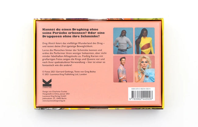 Ein Memo mit Glam-Faktor: Findet zu jedem King und jeder Queen das passende 'Alltags-Gesicht'! Das ist viel schwieriger, als ihr denkt, da die jeweilige Verwandlung einfach unglaublich ist! 50 Karten zeigen fantastische Vorher-Nachher-Fotos der glamourösen Drag-Transformationen, und die charmanten Texte im beiliegenden Booklet geben Einblick in die schillernden Persönlichkeits-Kreationen und die Menschen hinter Make-up, Styling und Pose. Wer die meisten Paare findet, gewinnt!